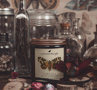 Warm and woody with a spicy finish. Create lasting and endearing memories with Saṃsāra, our spiced sandalwood-scented candle. A luxurious, coconut...