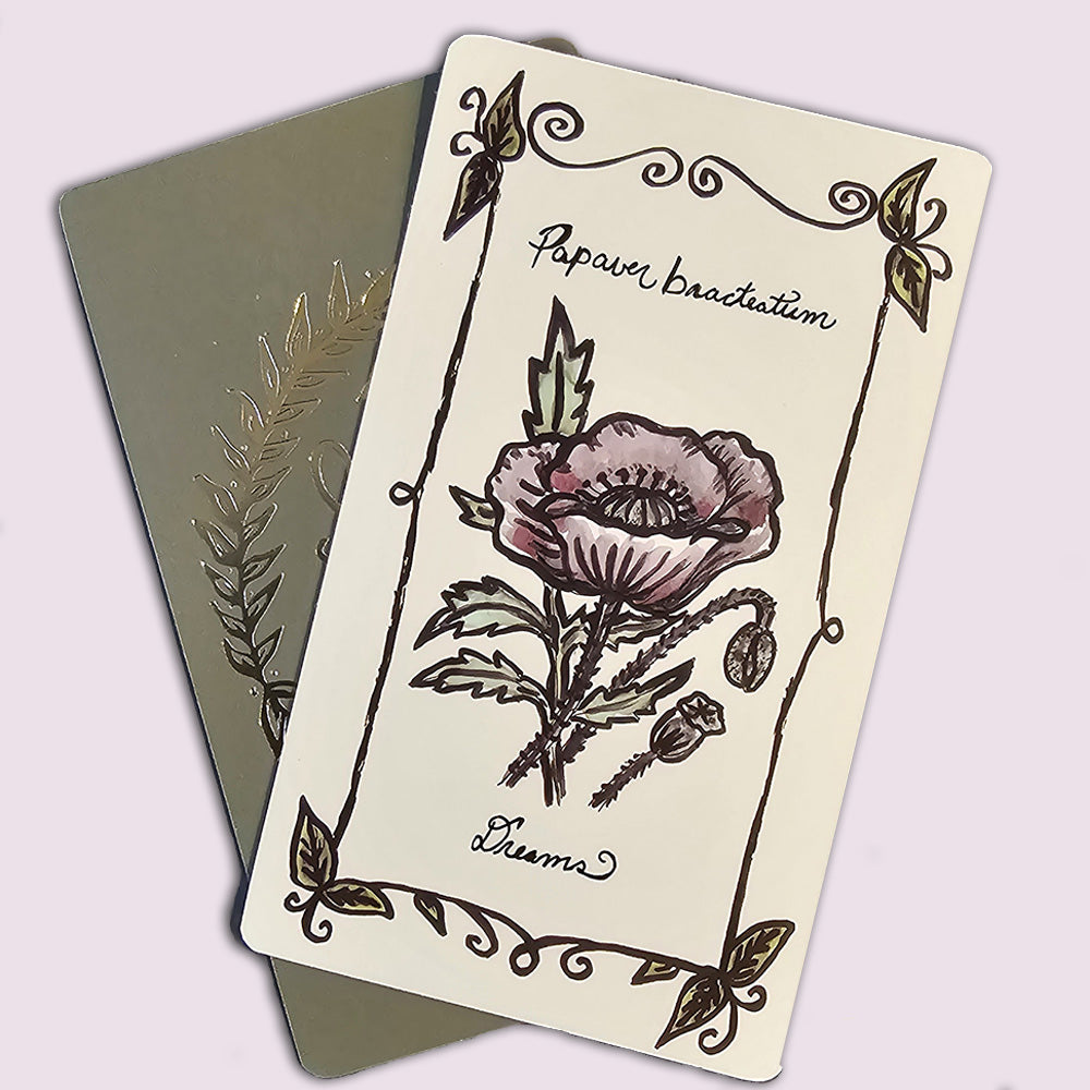 Sibyl of the Flora is an independent self-published deck that presents a daily oracle collection of 47 botanical paintings carefully crafted to serve as daily affirmations. These cards are meticulously made using plant-based inks personally prepared and gathered. Each daily affirmation card carries the distinct essence of the plant. It represents infusing it with a harmonious energy, which enhances the overall experience, highlighting the magical bond we share with botanicals and the healing benefits of embracing this connection.